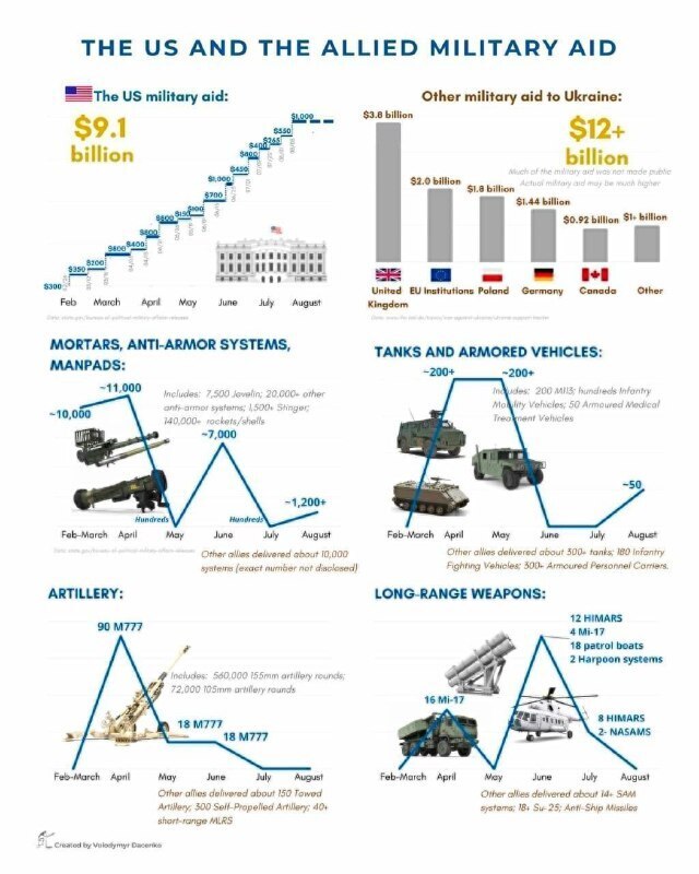 | Всего с начала проведения специальной военной операции на Украине уничтожено 263 самолета и 145 вертолетов. Об этом 6 августа сообщили в Минобороны России.Также уничтожено 1693 беспилотных летательных аппарата (БПЛА), 361 зенитный ракетный комплекс (ЗРК), 789 боевых машин реактивных систем залпового огня, 4259 танков и других боевых бронированных машин, 3270 орудий полевой артиллерии и минометов, и 4739 единиц военной автомобильной спецтехники.